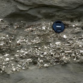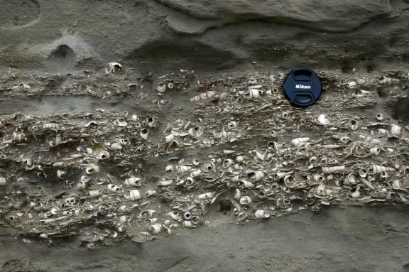 Bed of fossil molluscs (snails and clams and their kin) at White Rock River, Canterbury. The larger visible fossils are mostly the turret snail Tropicolpus abscisus, but there are many other species present also. These fossils are about 18 million years old. This shellbed illustrates a tiny part of New Zealand’s stunning fossil record of marine molluscs of the past 50 million years, which is the best in the Southern Hemisphere for this interval of time. The richness of this fossil record allows New Zealand paleontologists to tackle some fundamental questions about the nature of life on Earth and also the nature of the fossil record itself.