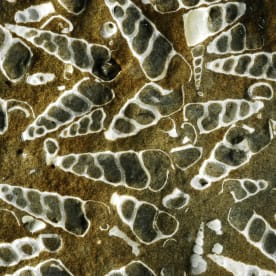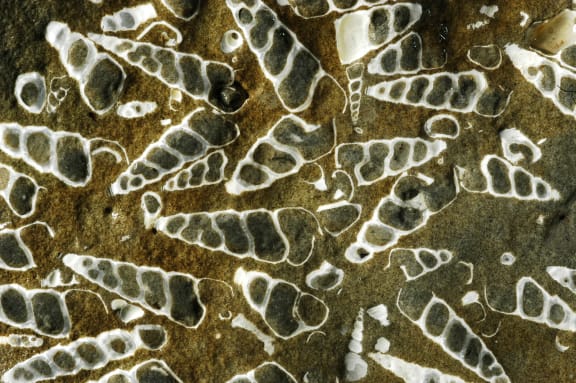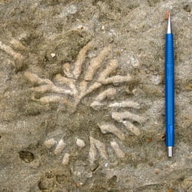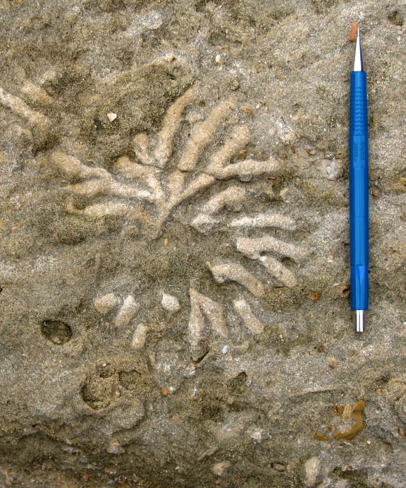 A different sort of fossil: this is a trace fossil – the marks left in sediment by the activities of an animal. In this case, some form of worm-like animal was burrowing within sea-floor sand, forming a set of radiating chambers that were subsequently infilled with different coloured sediment and preserved once the sand was turned to rock. These burrows are about 4 million years old and were observed on the coast of Hawkes Bay. Dinosaur footprints are another sort of trace fossil. Credit James Crampton