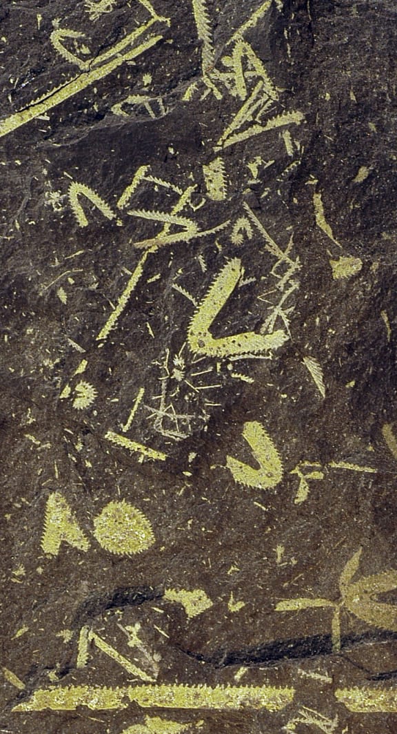 Slab of rock from Golden Bay, showing many specimens and several different species of fossil graptolite. Graptolites were a type of colonial animal that lived floating in the ocean. In life, each “tooth” on a colony corresponded to a small cup that contained one animal, and the colonies housed many animals. These animals used tentacles to feed on particles of food in the water. Each colony has been flattened during the fossilisation process, so that now the colonies look like drawings on the rock. The graptolites were a major component of the oceanic ecosystem between about 500 and 400 million years ago, during the Paleozoic Era. Although they were a diverse and ‘successful’ group of organisms for about 80 million years, they became extinct 411 million years ago. The long dimension of the slab is 18 cm