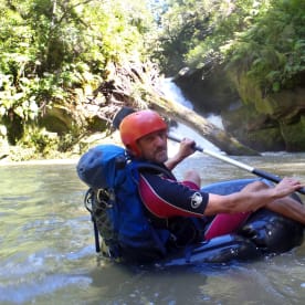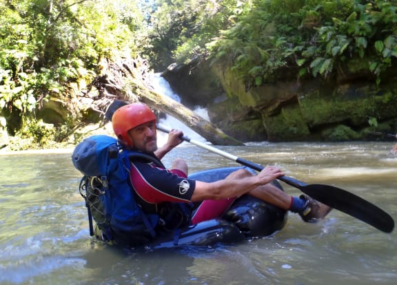 James Crampton hunting dinosaurs in a tributary of the Mohaka River, Hawkes Bay. The truck tube was slowly deflating and became increasingly difficult to ride! Photo credit Julian Thomson, GNS Science