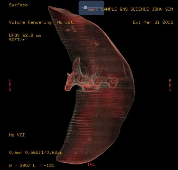 Large block of rock containing mosasaur teeth, collected from the ranges of inland Hawkes Bay. The fossil is about 70-80 million years old. The rock has been scanned in a medical CT scanner and the teeth have been reproduced using a 3D printer. Credit GNS Science.