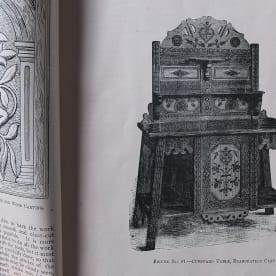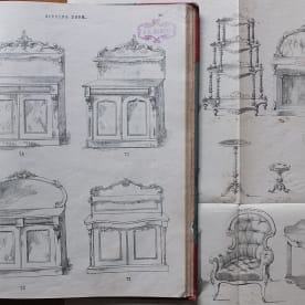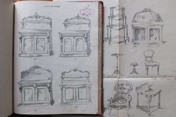 This is the Dunedin pattern book (NZ's oldest) printed in 1875 for the firm Craig & Gillies showing chiffoniers in the popular rococo-style. Craig and Gillies had actually illegally reprinted their pattern book mostly from London furniture makers Jenks & Holt's (1869) designs.