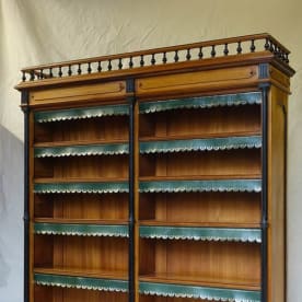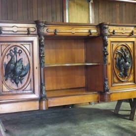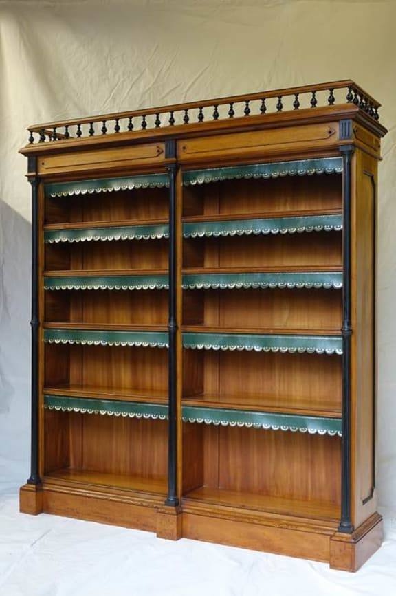 The Larnach Castle Gothic style bookcase in rimu, kauri, rewarewa and ebony, ca1875 following restoration". It was originally found in a New Brighton second-hand shop.