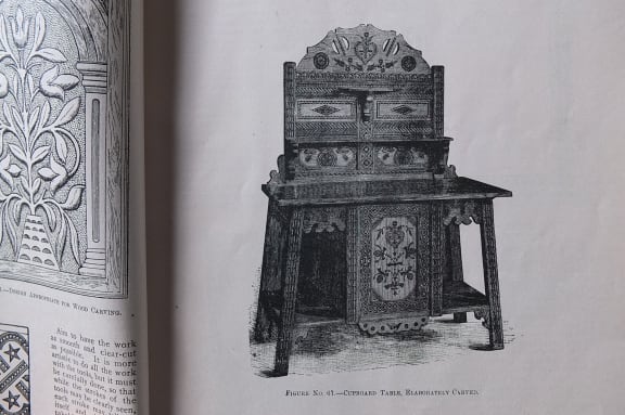 This is the original pattern published in 1893 that was the basis of the totara and kauri 'Hall Cabinet'