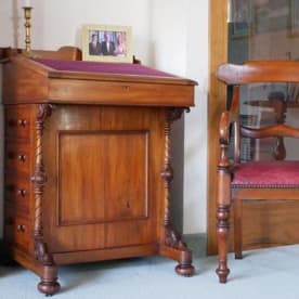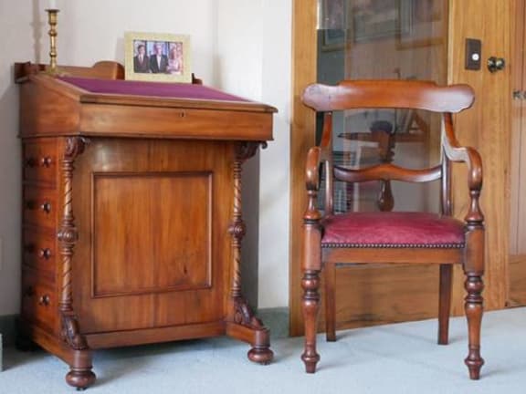 A small desk or more correctly Davenport. It is rimu amde ca.1865 in the 'Elizabethan' style and once owned by Rev. Vicesimus Lush when he was vicar of Howick [and then later Thames goldfields). The chair on the right is a kauri 'Trafalgar or Grecian carver' I rescued from a 'restorer' in Auckland about 35 years ago. He had done an enormous amount of damage to it and it was quite challenging to put right.