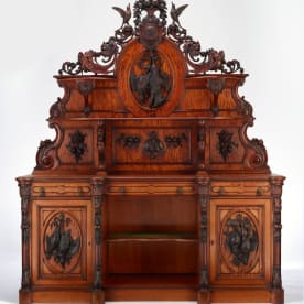This is the base to the William White sideboard during restoration. Made in Auckland ca1872 in mottled kauri, cedar and mahogany. This is now in Te Papa.