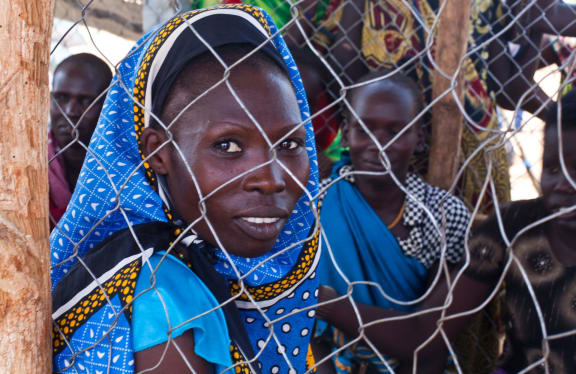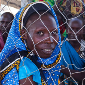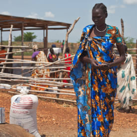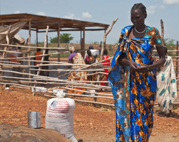 A woman at the Juba Protection of Civilians site waits to receive her monthly food rations. More than 200,000 people live in these sites around South Sudan, seeking protection from violence from the UN, and sustenance from NGOs. As many as 5.3 million people could face severe food insecurity this summer in South Sudan, because of conflict, poor harvests, and the mass displacement of people.