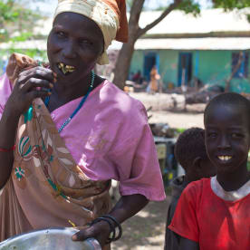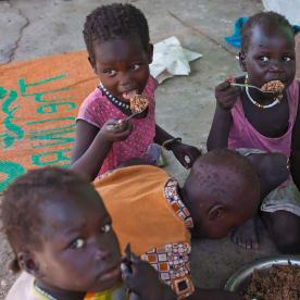 World Vision partners with the WFP to distribute food in the JubaPOC. Each month World Vision distributes cereals, pulses, vegetable oil, salt, and fortified blended food for malnourished children, to the residents of the camp. The rations are scientifically broken down into nutritional needs providing essential amounts of carbohydrates, protein, fat and iodine.