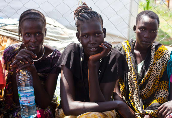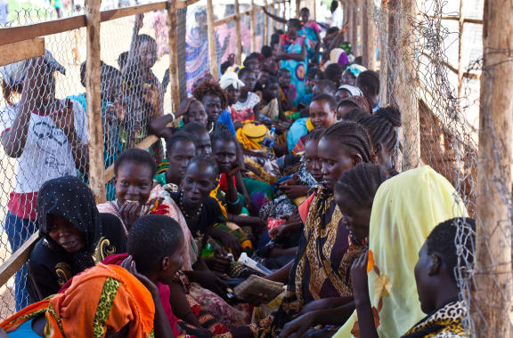 Women at the Juba POC line to receive their monthly food rations. Each month each resident of the camp receives a vital supply of food, and vouchers to use at the local market through a sophisticated ration and distribution system.