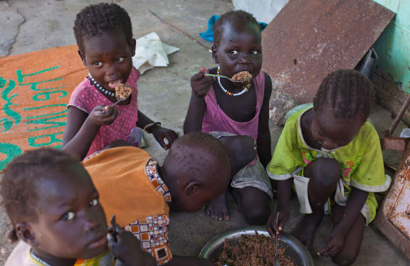 These children were living in a school destroyed by the fighting in Malakal. They were eating a mixture of grain and cooked leaves.
