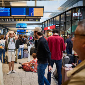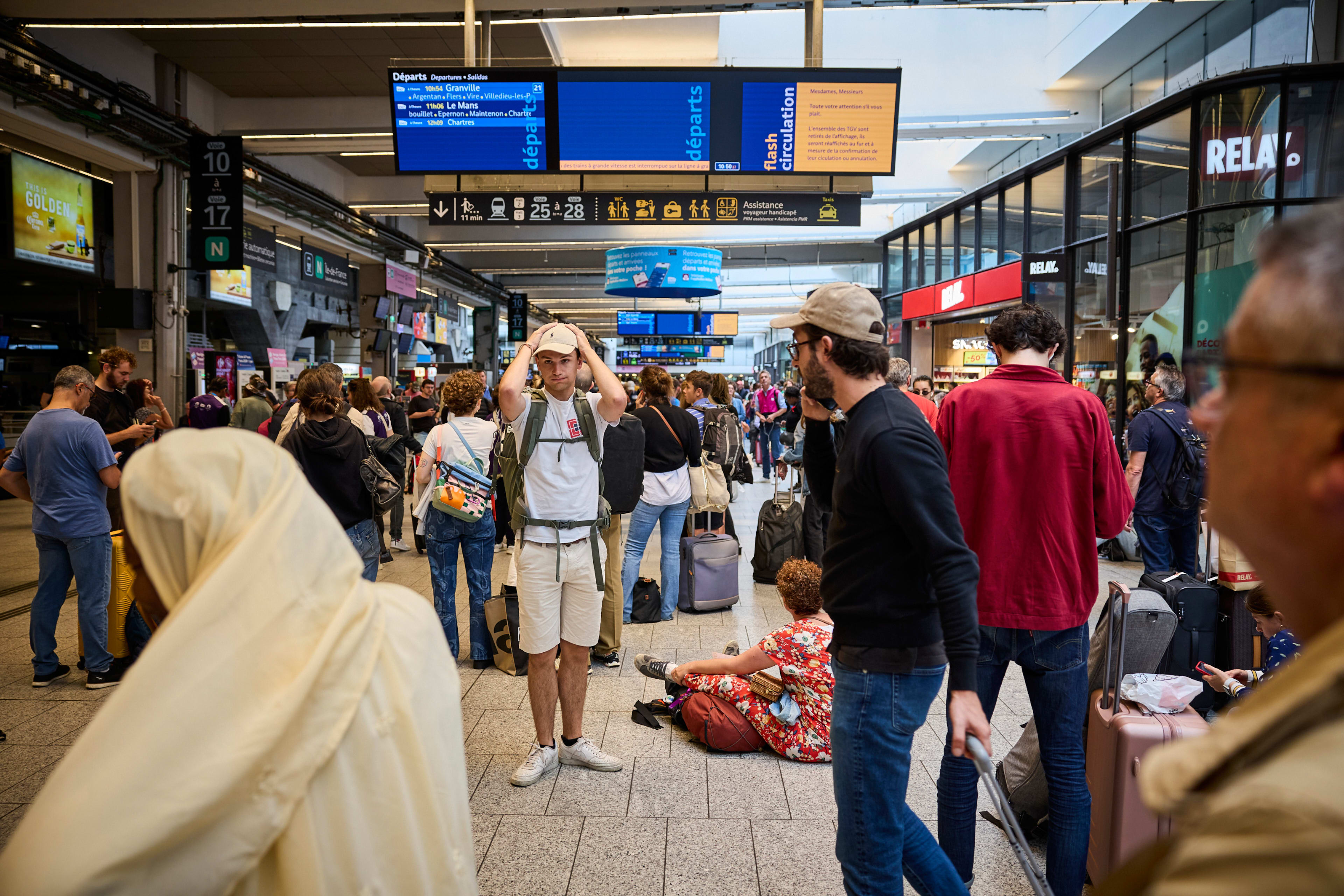 Commuter chaos at Montarpanasse station in Paris, following a series of suspected co-ordinated arson attacks on the high-speed national rail network and ensuing widespread train cancellations. Paris, France. Photograph by David Levene 26/7/24 (PHOTO: David Levene)