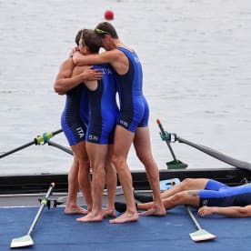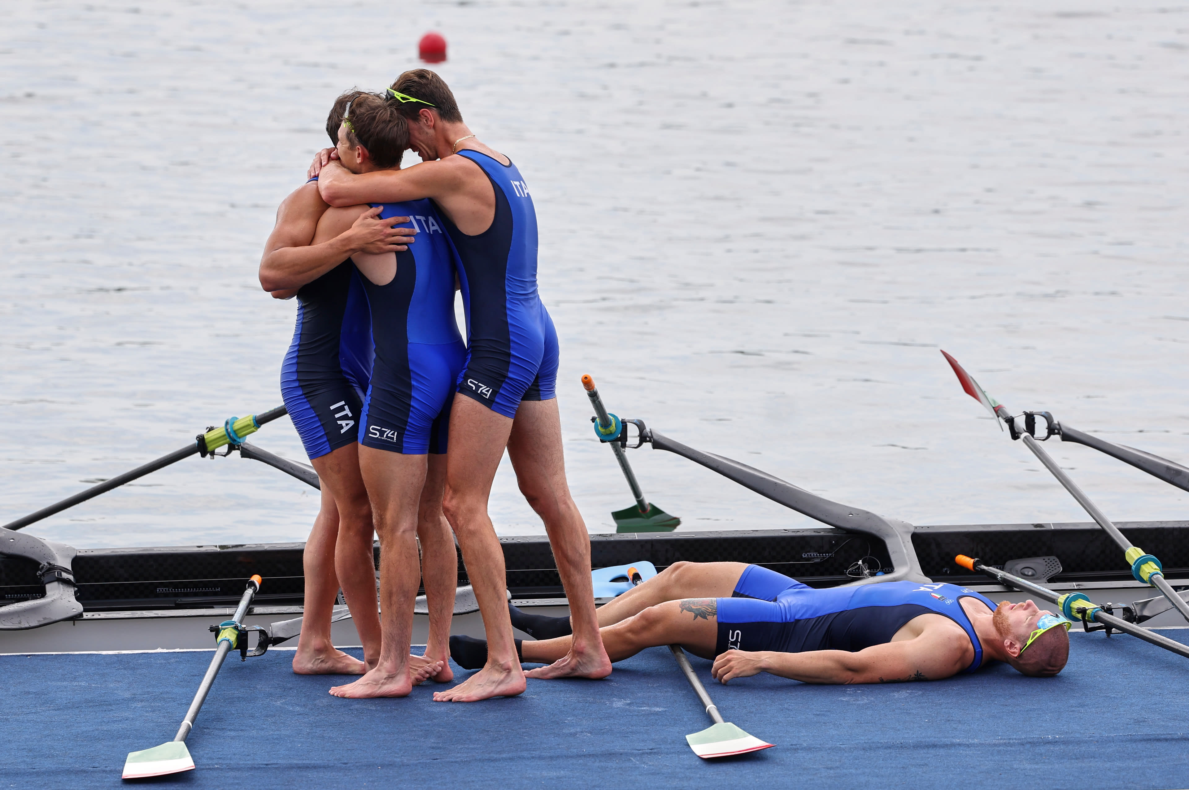 Italy get silver in the Men's quad sculls final event at Vaires-sur-Marne Nautical Stadium outside Paris. France. Photograph by David Levene 31/7/24 (PHOTO: David Levene)