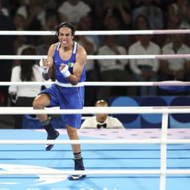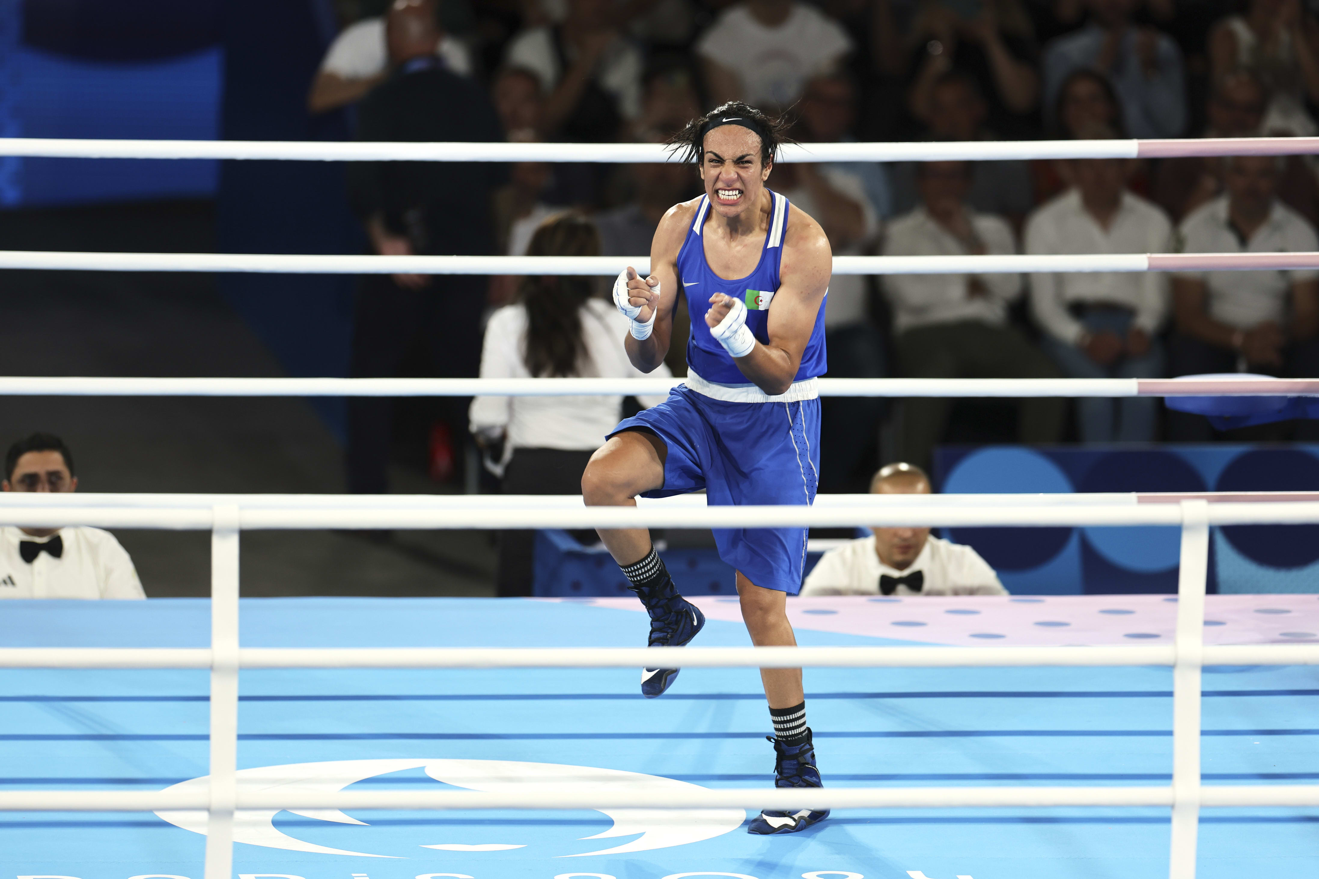 Imane Khelif of Algeria celebrates after winning her semi-final bout against Janjaem Suwannapheng of Thailand at the Paris Olympics 2024. Roland Garros stadium, Paris, France. Photograph by David Levene 6/8/24 (PHOTO: David Levene)