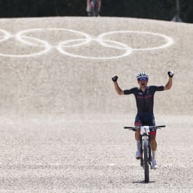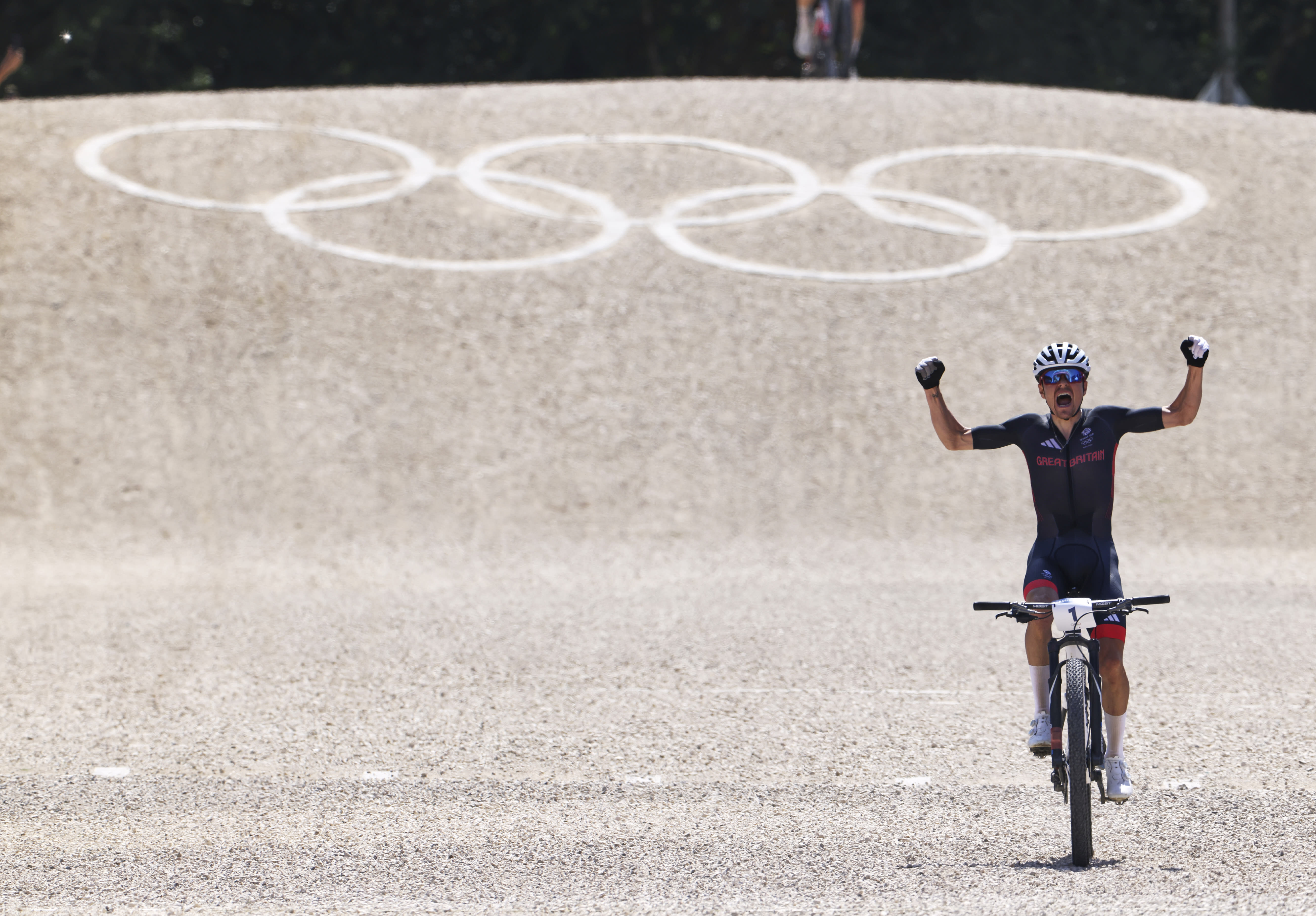 Tom Pidcock wind gold in the Mountain Biking event at the Paris Olympics 2024. Elancourt Hill. Paris, France. Photograph by David Levene 29/7/24 (PHOTO: David Levene)