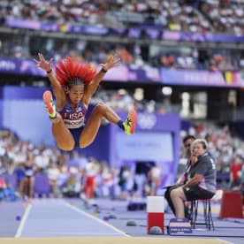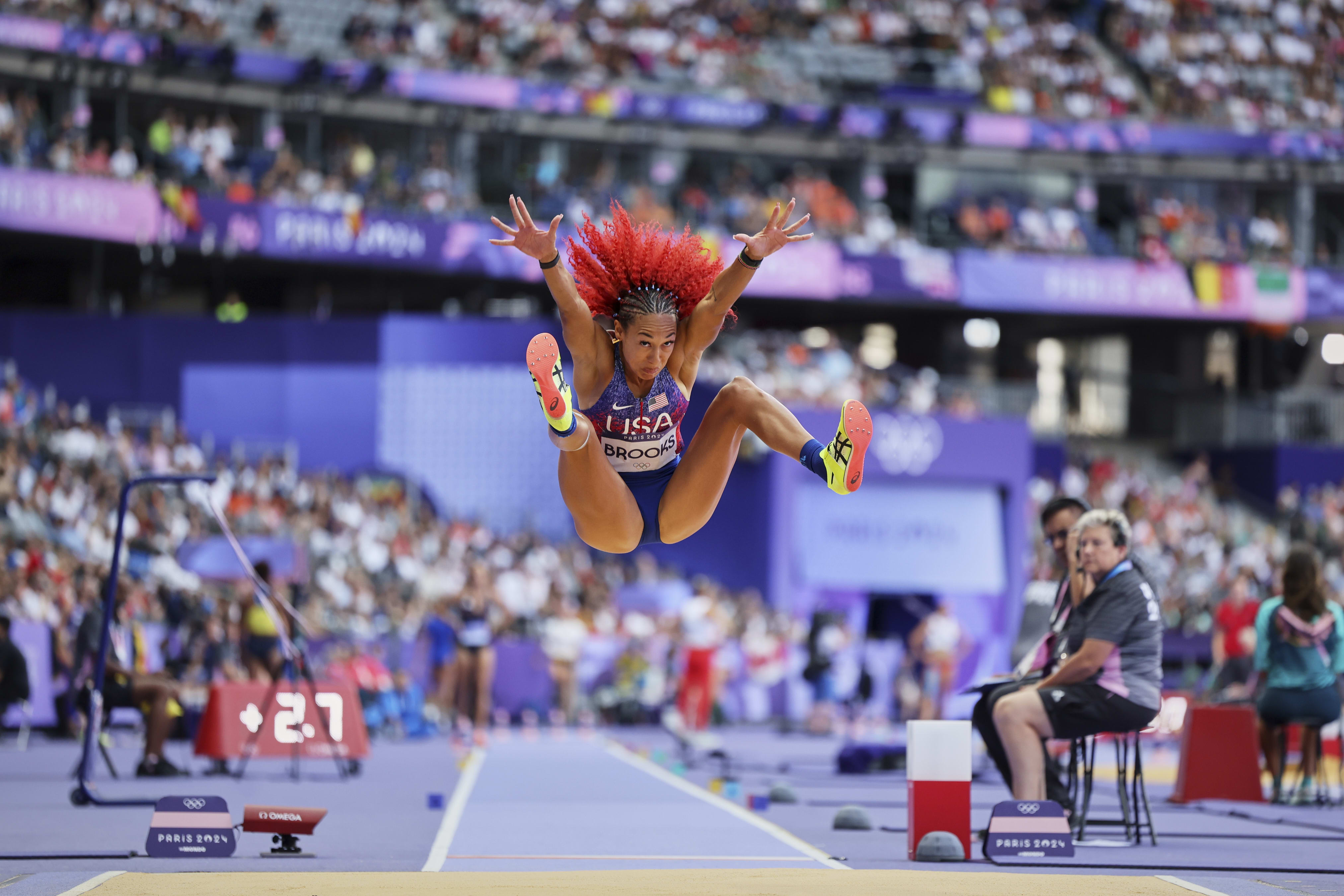 Taliyah Brooks of USA competes in the long jump. Women's Heptathlon long jump on day fourteen of the Olympic Games Paris 2024 at Stade de France on August 09, 2024 in Paris, France. Photograph by David Levene 9/8/24 (PHOTO: David Levene)