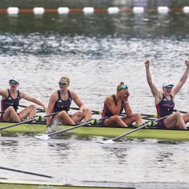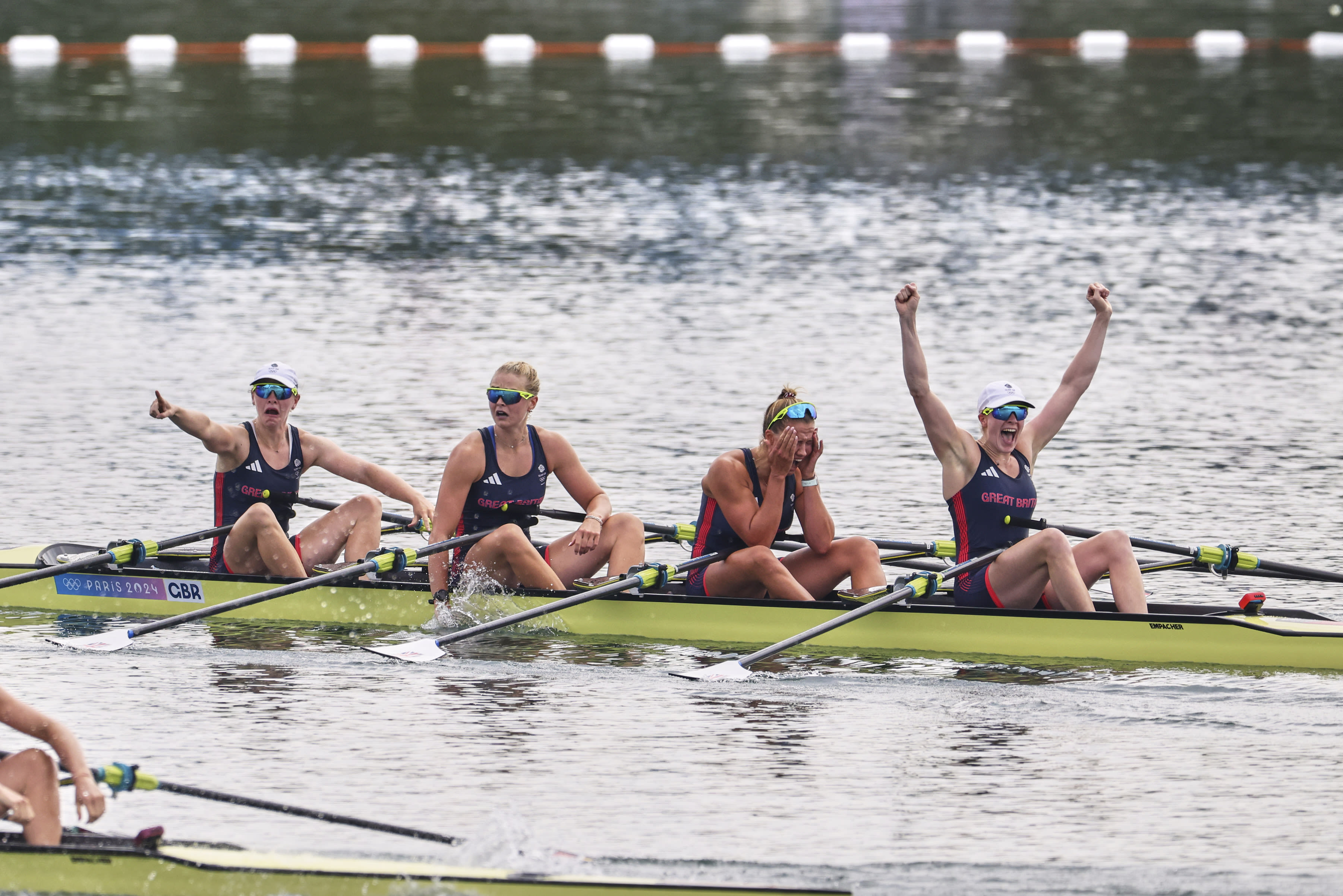 Gold for team GB in the Women's Quad Sculls rowing competition at Vaires-sur-Marne Nautical Stadium outside Paris. France. Photograph by David Levene 31/7/24 (PHOTO: David Levene)