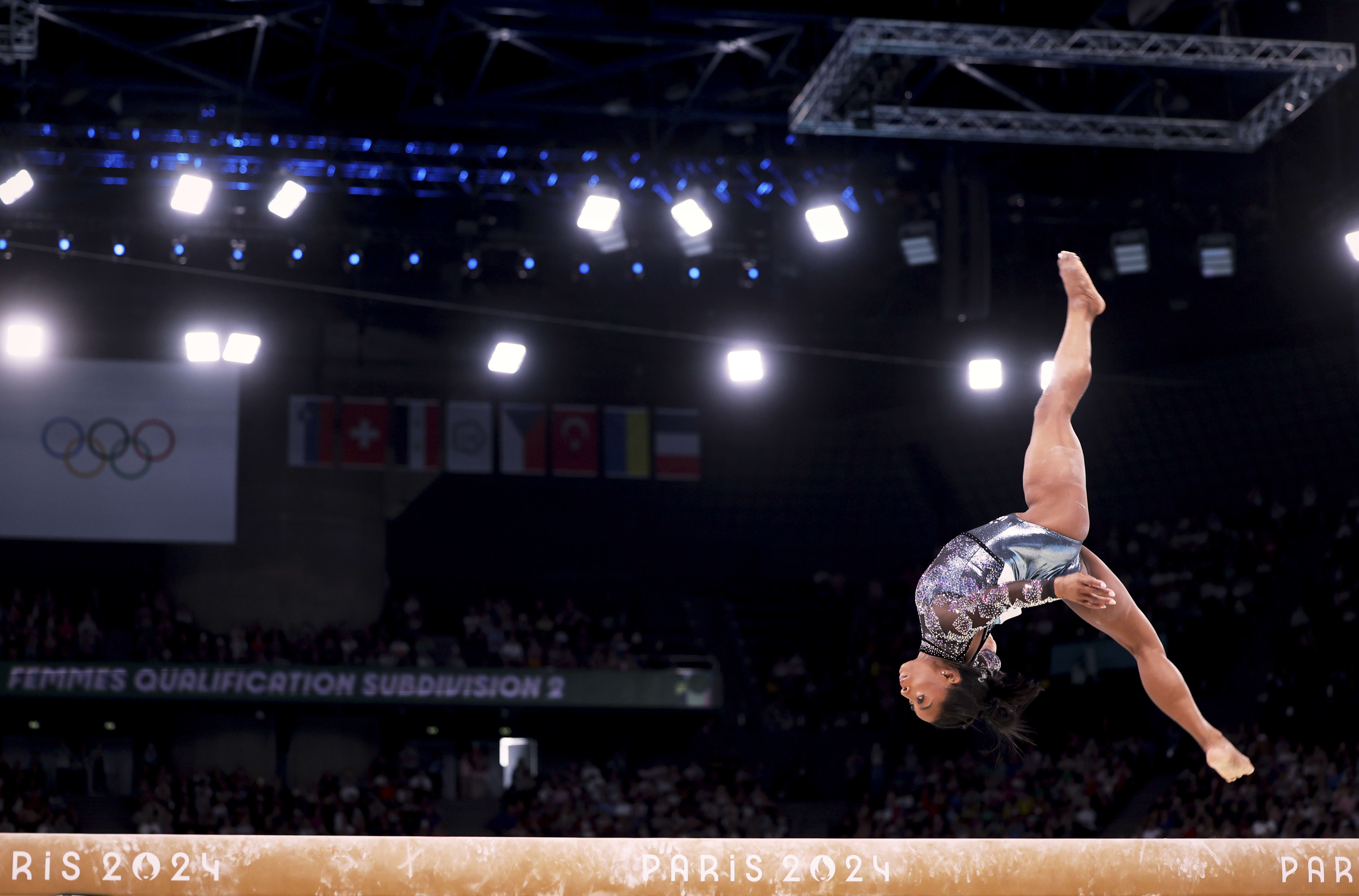 Simone Biles. USA team. Women's Qualification for Artistic Gymnastics. Bercy Arena. Paris Olympics 2024. Paris, France. Photograph by David Levene 28/6/24 (PHOTO: David Levene)