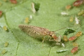 A Tasman Lacewing with an aphid. These Lacewing are known to be useful in indoor and outdoor crops such as, capsicum, cucumber, citrus, and other ornamentals