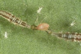 Mite-A pictured with a thrip larvae. Mite-A are known to be useful on greenhouse crops such as tomato, cucumber, pepper and ornamental plants.
