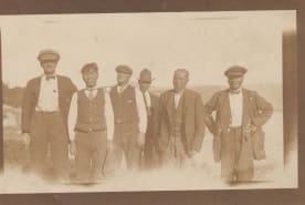 The patients with Lyttelton Harbour in the background, early 1920s: from left, George Phillips, Ah Yip, Jim Lord, Ivon Skelton, Ah Pat and Pakira Matawai. Christchurch Anglican Diocesan Archives, Parish of Lyttelton Collection, PAR039