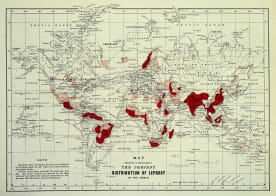 Part of an 1891 map showing the distribution of leprosy around the world. The disease was uncommon in New Zealand, but the lines showing the shipping routes from the Pacific, China and India suggest how easily it might spread. From George Thin, Leprosy, Percival and Co., London, 1891, Wellcome Collection, CC BY 4.0