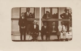 The patients on a hut verandah. The man standing in front of the railing on the left is most likely one of the Lyttelton residents who visited the patients to give them some company; the others, from left, are Ivon Skelton, Will Vallance, Ah Yip, Jim Lord, George Phillips, Ah Pat and one other, unidentified. Christchurch Anglican Diocesan Archives, Parish of Lyttelton Collection, PAR039