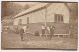 Patients playing ‘clock golf’ in front of the unused recreation hall: from left, Will Vallance, Jim Kokiri, Ah Yip, Jim Lord, Ipirini Apa Apa and Ivon Skelton. Other pastimes included gardening, chopping wood, playing billiards and reading. Photograph c.1923, Lyttelton Museum