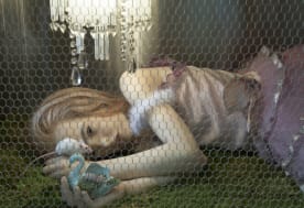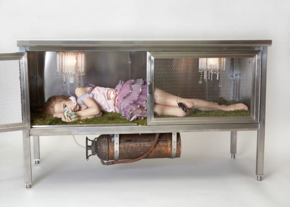 Meghan Boody. The Mice & Me, 2008, Clothed silicone life-cast figure with human hair and glass eyes, in stainless steel cabinet with moss, surgical kidney dish, beaver pelt, rodent feed, mice, timer and water pump system, edn 1/3 with unique components. Born 1964, New York, NY, USA, where she lives and works.