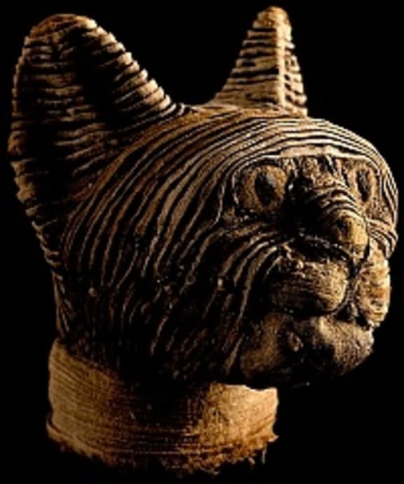 Head of a mummified cat, Egypt, Late Period to Ptolemaic, c. 664–30 BCE, Unknown, Animal remains, linen and resin.