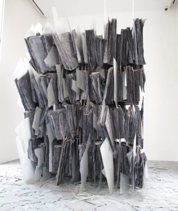 Anselm Kiefer, Sternenfall/Shevirath ha Kelim, (Falling Stars/Destruction of the Vessels), 2007. Bookcase comprising two iron elements with lead books (190-200 volumes) and glass. Born 1945, Donaueschingen, Germany; lived and worked 1993–2010 at Barjac, near Nîmes, France; and also since 2000 in Paris, France.