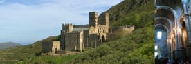 (left) View of Sant Pere de Rodes, Costa Brava; (right) Interior, Church Sant Pere de Rodes
