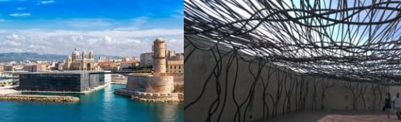 (left) The Museum of European and Mediterranean Civilisations (MuCEM) in Marseilles, France; (right) rooftop, MuCEM
