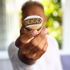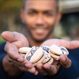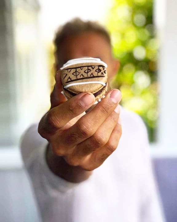 Bert Jang and a hand-made macaron which he draws masi designs on.